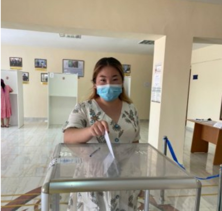 Нағи Ілиясов ауылындағы №165 учаскесіне келген жергілікті халық ауыл әкімініне үміткерлерге дауыс беруде. Менде бүгін өз таңдауымды алғаш рет жасадым. Елді мекендегі 1330 сайлаушының ішінде әуыл әкімініне үміткерге тұңғыш рет дауыс бергеніме қуаныштымын.