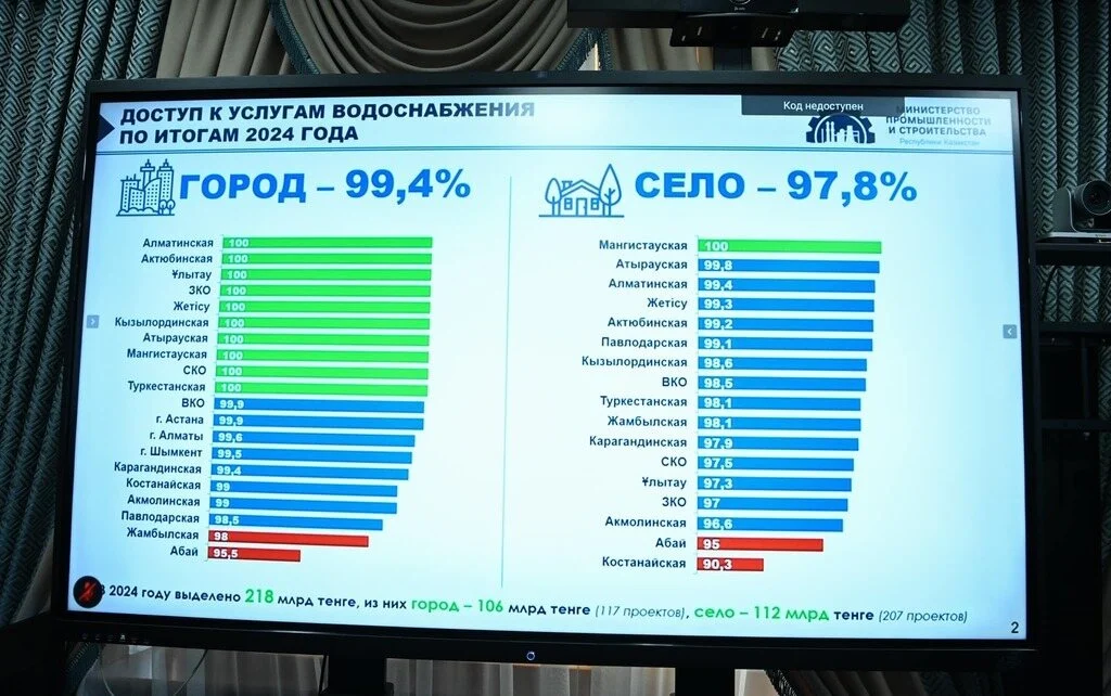Кеше Премьер-министрдің орынбасары Қанат Бозымбаевтың төрағалығымен қалалар мен ауылдарды таза ауызсумен қамтамасыз ету мәселесі талқыланған кеңес өтті. Басқосуда Өнеркәсіп және құрылыс министрі Қанат Шарлапаев Сыр өңіріндегі қалалар түгелдей 100 пайыз ауызсумен қамтылғанын, ал облыстың ауызсумен қамту көрсеткіші 98,6 пайызға жеткенін айтты.