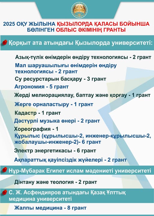 Оның ішінде, Қызылорда қаласы және қалаға қарасты кенттер мен ауылдық округтердегі орта мектеп бітірушілеріне техникалық, ауыл шаруашылығы, агрономия, қызмет көрсету, энергетика, құрылыс салалары бойынша бакалавр академиялық дәрежесінде мамандарды дайындауға 34 грант, жалпы медицинаға 8 грант бөлінді.