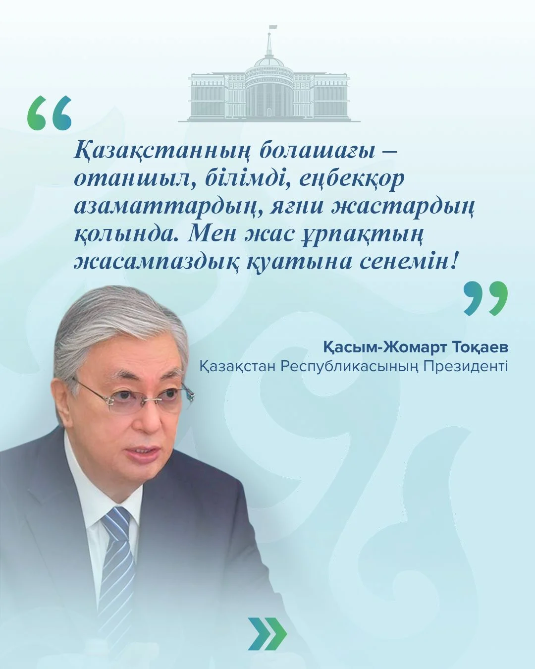 «Қазақстанның болашағы – отаншыл, білімді, еңбекқор азаматтардың, яғни жастардың қолында. Мен жас ұрпақтың жасампаздық қуатына сенемін!» – Қазақстан Республикасының Президенті Қасым-Жомарт Тоқаев