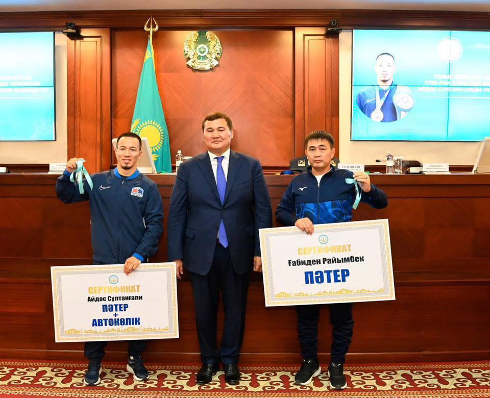 Бүгінгі мерейлі сәтте барша Сыр жұртшылығының атынан Айдос бауырымызға жаңа автокөлік пен пәтер кілттерін, бапкері Ғабиденге де жаңа пәтер беру туралы шешім қабылдадық.