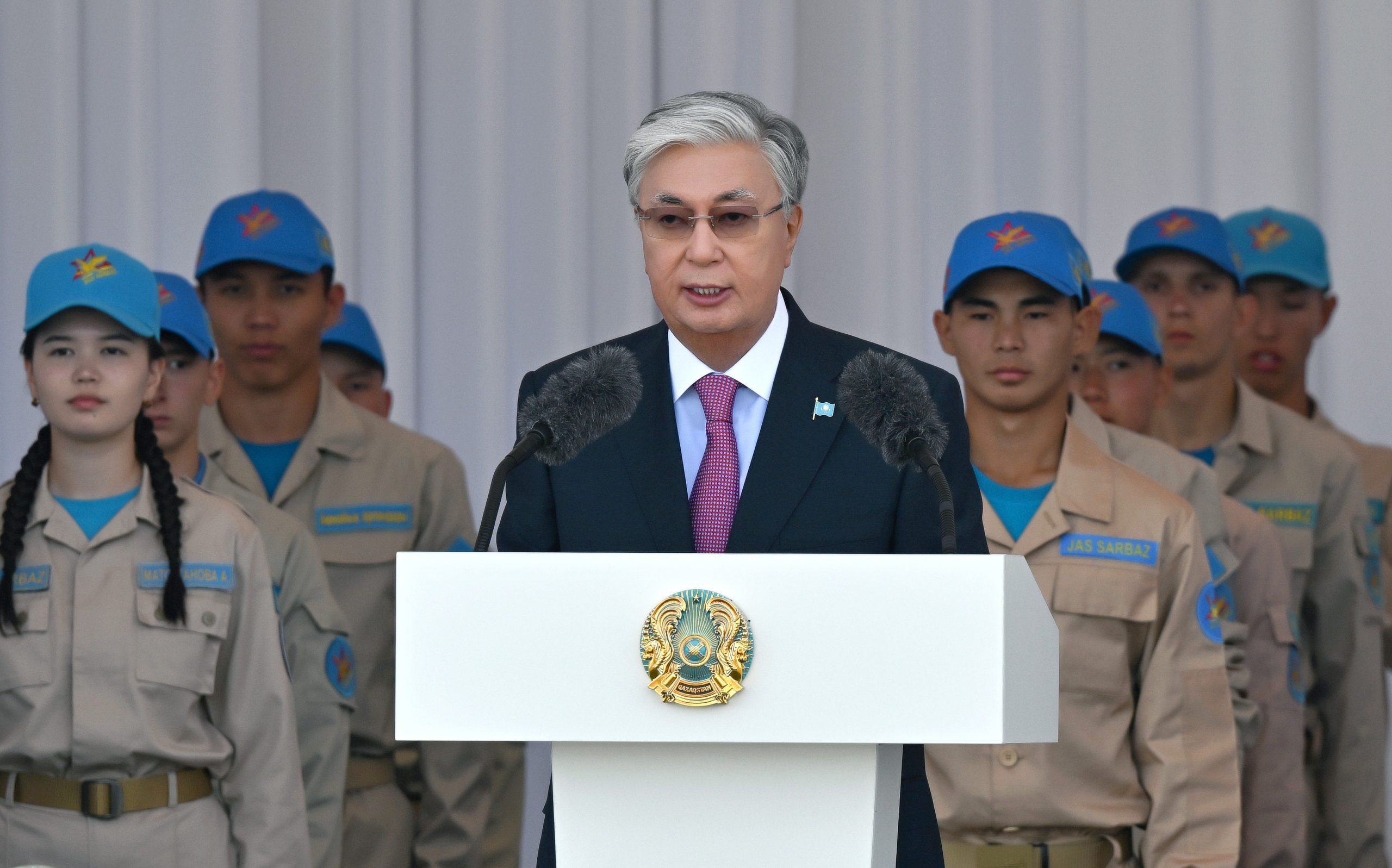 – Қуатты Армия – тәуелсіздік тірегі, қарқынды даму кепілі. Бүгін сапта тұрған сарбаздар – нағыз отаншыл, батыл, мықты азаматтар. Қазақстан Армиясының келешегі сіздердің қолдарыңызда! Әділетті және Қауіпсіз Қазақстанды құратын да – Сіздер. Мен Жоғарғы Бас қолбасшы ретінде еліміздің білімді, адал, озық жастарына сенемін! Алдағы күндері сіздердің қаншалықты күшті әрі епті екендеріңіз сыналады. Әскери қызметтің қандай болатынын сезініп, заманауи армияның озық технологияларымен танысасыздар. Нағыз жауынгер табанды еңбек, қатаң тәртіп пен жауапкершілік қана жеңіске жеткізетінін біледі. Тактикалық ойындар кезінде сіздерге батылдық пен шешімталдық қажет болады. Командамен ұйымдаса әрекет ету, бір-біріңе көмектесу талап етіледі. Бүгін осы жиында Қазақстанның намысын «Жас сарбаз» әскери-патриоттық қозғалысының ең үздік мүшелері қорғайды. Жастарымыз жарысқа лайықты деңгейде қатысып қана қоймай, өздерін осы елдің қонақжай әрі кеңпейіл иесі ретінде көрсететініне сенімдімін. Осы жиыннан жаңа дағды үйреніп, адал дос тауып, керемет әсермен оралуларыңызға тілектеспін. Баршаңызға сәттілік тілеймін! – деді Қасым-Жомарт Тоқаев.