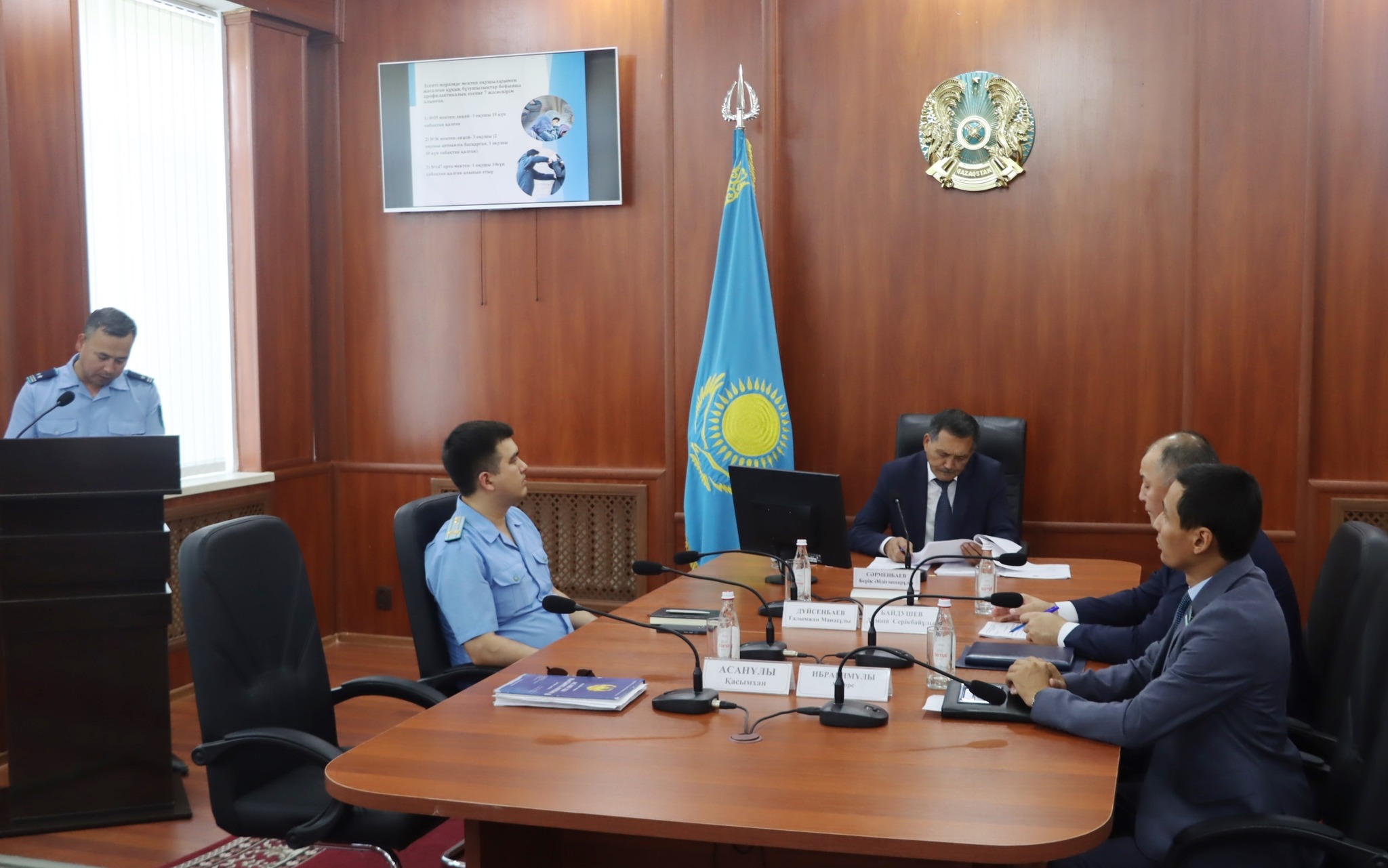 Күн тәртібі бойынша «Кәмелетке толмағандар арасындағы құқық бұзушылықтарға жол бермеу, алдын алу мақсатында қабылданған шаралар туралы» және «Жеке адамға қарсы жасалған қылмыстардың орын алу себептері мен оларды болдырмау мақсатында айқындалған міндеттер туралы», «Жол жүрісі қауіпсіздігін қамтамасыз ету шаралары туралы» үш бірдей мәселе қозғалды.