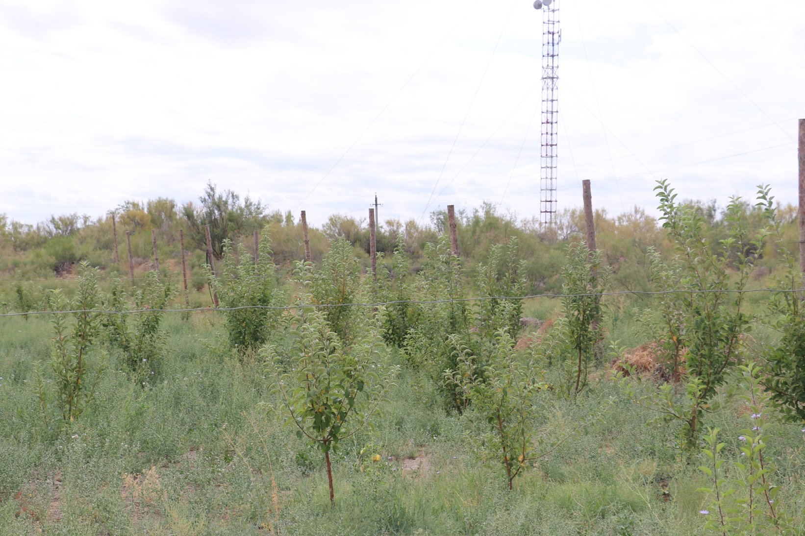 Тамшылату әдісімен суарылатын алма шыбықтары бүгінде кісі бойымен бірдей. Бұйырса, келер жылы гүлдеп, түйнек бере бастайды.