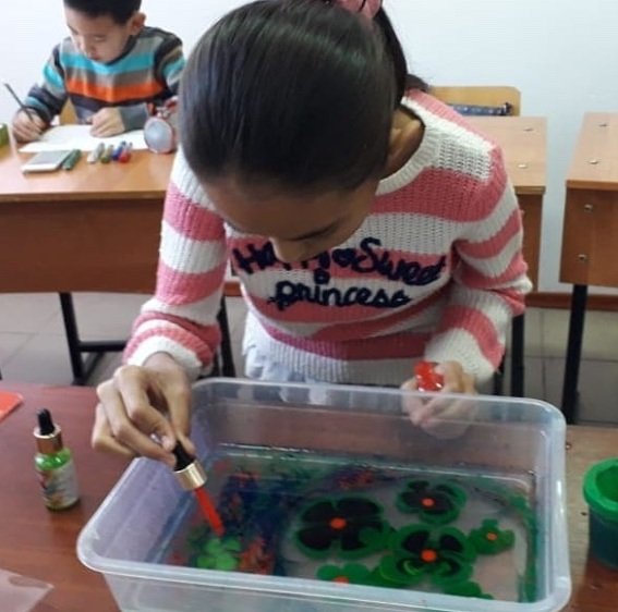 – Алғашында «Су бетіне сурет салу мүмкін бе?» деген сауал қойып, күмәнданатындар табылатын. «Эбру» сонысымен де ерекше шығар. Әрі түркілер ойлап тапқан арт терапияның бұл түрі қауіпсіз саналады. Қолына қылқалам ұстаған кез келген адам қиялға ерік беріп, төл туындысын жасап шығады. Сонымен қатар жеке шығармашылықты дамыту үшін де су арқылы қағаз бетіне түскен суреттің орны зор. «Эбру» жаңа дүниелер ойлап табуға да септігін тигізеді. Дүниежүзінде аталған өнерді «Биші бояулар», «Бұлт пен жел», «Толқын тәрізді қағаз» деп атайды. Бірақ, бұл өнер түрі ерекше даярлықты, шыдамдылықты талап ететінін ескеру қажет. Үйірме қатысушыларына осыны жиі айтамын. 30 шақты шәкіртім бар. Негізінен, балаларды 4-5 жастан бастап қабылдаймыз, ақылы негізде. Араларында икемделіп, біраз төселіп қалғандары бар. Соның ішінде Дәулет Ермекбайды ерекше атар едім. Себебі, жас талант бұған дейін түрлі байқауларда өзін дәлелдеп, өнерімен тамсантты. Жасаған дүниелеріне таңданбау мүмкін емес, – деді өнер мектебінің қосымша білім беру педагогі Аида Бердеева.