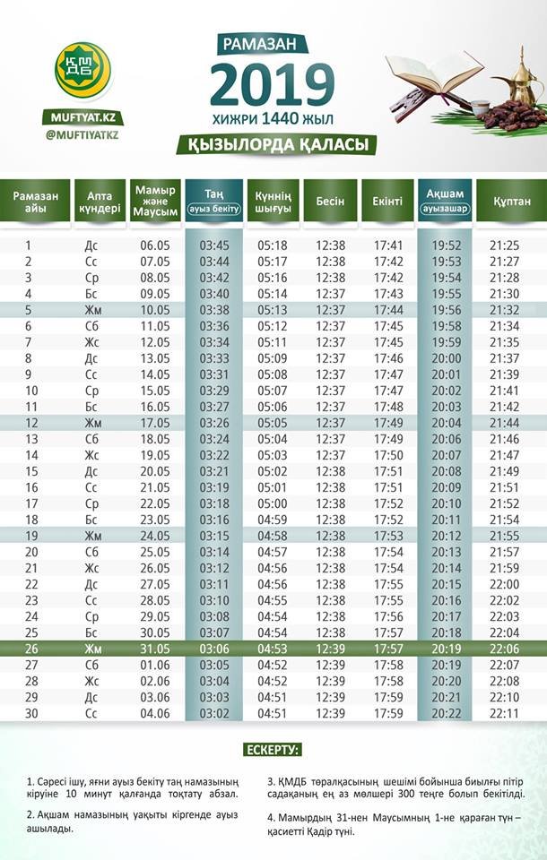 Осы орайда Қызылорда облысының тұрғындарына арналған ауыз бекіту мен ауызашар уақытын назарларыңызға ұсынғанды жөн көрдік.