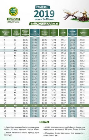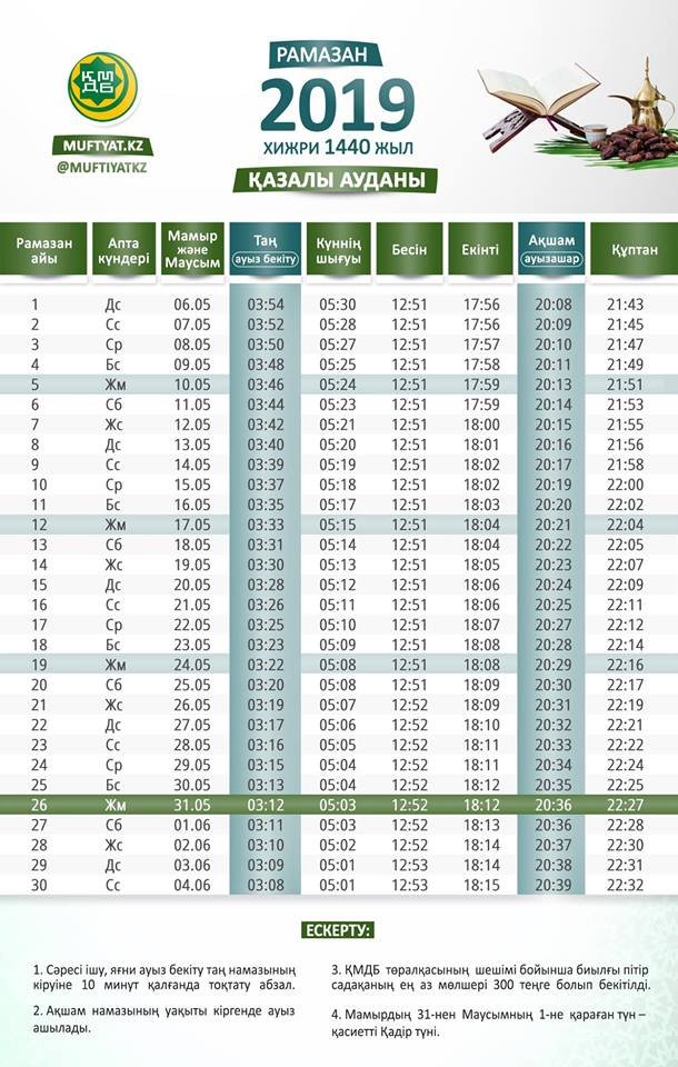 Назарларыңызға 2019 жылғы Қазақстан елді мекендерінің Рамазан айындағы ораза және намаз кестесін ұсынамыз! ҚМДБ Төралқа Мәжілісі мүшелерінің бірауызды шешімімен биылғы пітір садақа мөлшері – 300 теңге болып бекітілді, – деп хабарлады muftyat.kz. Пітір садақаны Рамазан айының бірінші күнінен ораза айт намазына дейін беруге болады.