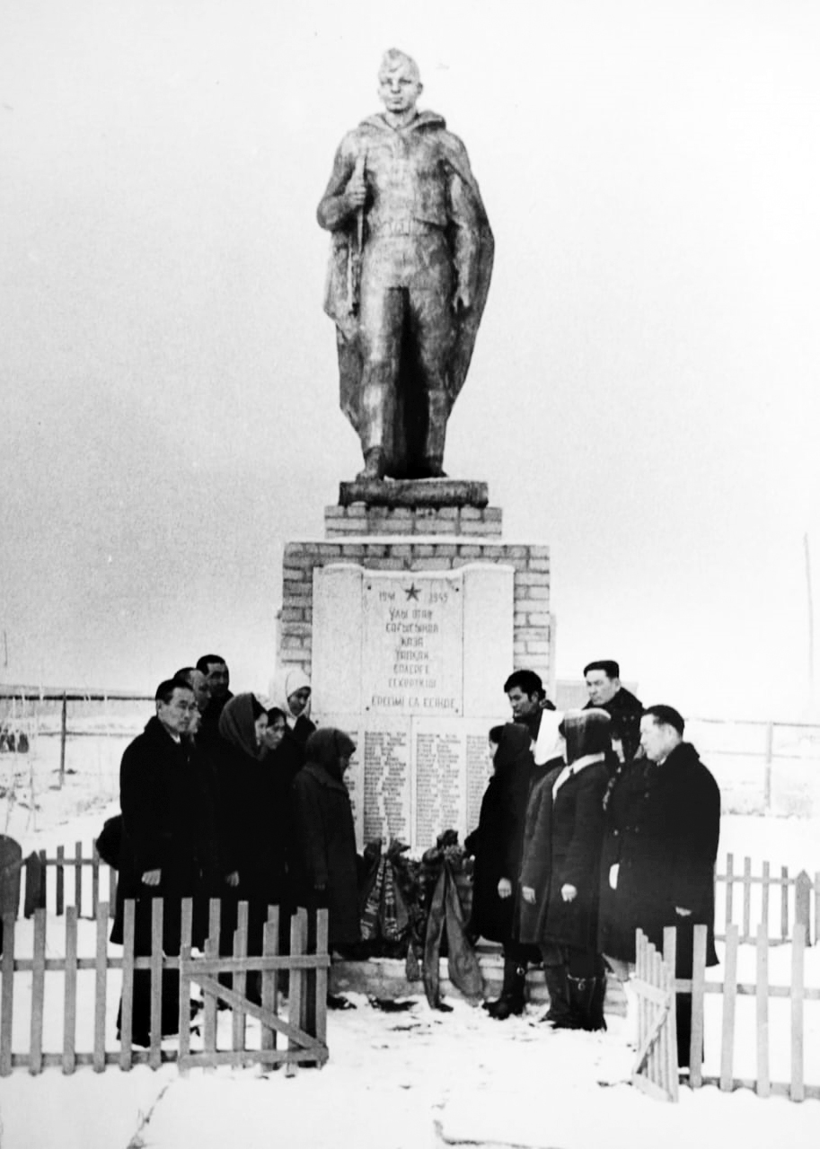 Тұғырымен қоса есептегенде биіктігі бес метрлік автомат асынған, пилоткалы жас қазақ солдатының тас мүсіні сол күні ақ жібекпен жабулы тұрды. Поштаның жанындағы бағана басына орнатылған репродуктордан соғыс уақытындағы және одан кейінгі кезеңдерде шыққан патриоттық әндер шырқалды. Ауылға жан-жақтан ағылып келіп жатқан жеңіл көліктерде есеп жоқ. Әскери УАЗ-452 жеңіл көлігімен келген парадтық үлгідегі форма киген бір майор мен лейтенантты және алты жауынгерді көргенде көзіміз жайнап кетті. Себебі ол кездерде әскери форма кигендерге елдің, әсіресе біздей мектеп оқушыларының құрметі ерекше еді.