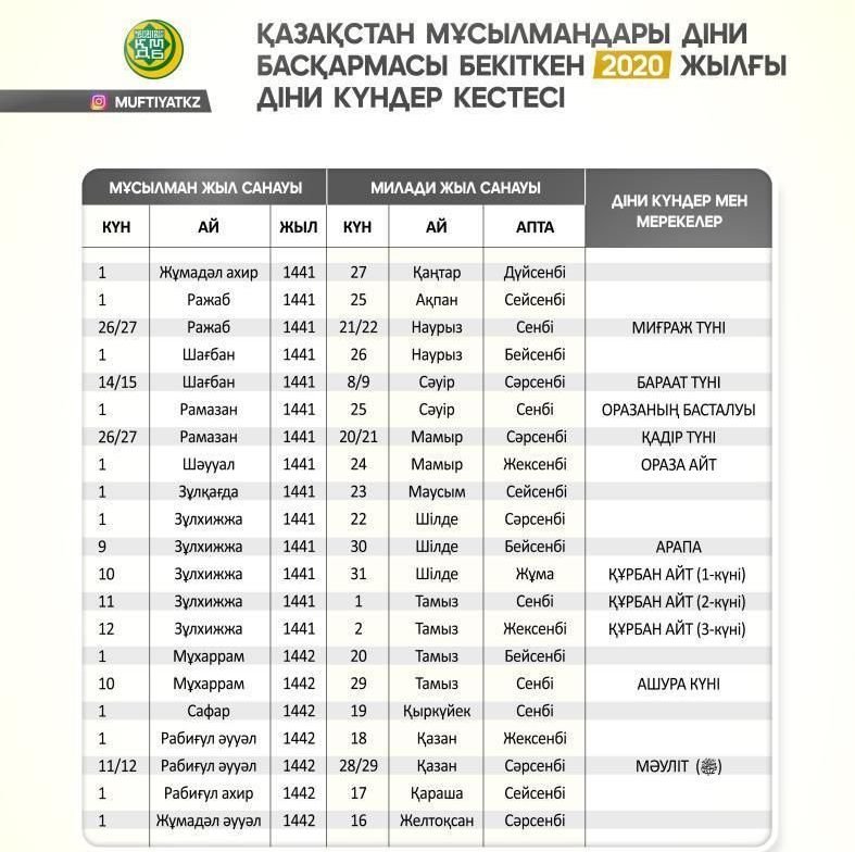 Қазақстан мұсылмандары діни басқармасының ресми сайтында 2020 жылғы діни күндер күнтізбесі жарияланды, – деп хабарлады 24.kz.Оған сәйкес, қасиетті Рамазан айы 25 сәуірде басталады, ал Құрбан айттың бірінші күні 31 шілдеге тұс келеді. 20 мамырдан 21 мамырға қараған түні мұсылман жамағат Қадір түнін қарсы алса, Ораза айт мейрамын 24 мамырда, Құрбан айтты 31 шілдеден бастап атап өтеді.