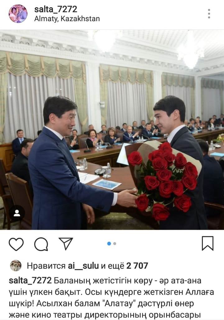 «Баланың жетістігін көру – әр ата-ана үшін үлкен бақыт. Осы күндерге жеткізген Аллаға шүкір! Асылxан балам «Алатау» дәстүрлі өнер және кино театры директорының орынбасары болып тағайындалды. Қуанышты көпшілікпен бөліссең еселене түседі. Құттықтап қойсаңыздар болады. Балам, артылған сенімді абыроймен ақтарсың, жұмысыңның жемісін көр» , – деп жазды актердің анасы.