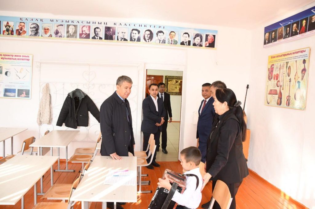 Аудан әкімі Оқушылар үйінен кейін аудан орталығындағы Қорқыт Ата атындағы аудандық балалар музыка мектебіне барды. Қорқыт Ата атындағы өнер мектебі 1964 жылдан бастап жұмыс жасап келе жатқан аудандағы бірден-бір өнер ошағы. Талай толағай таланттардың тамырына нәр берген, шәкірттерін шынайы өнердің шыңына шығарған өнегелі өнер ордасы. Бүгінде іргелі ұжымда жоғарғы дәрежелі 70-ке жуық педагог 850 оқушыға музыканың 15 бағыты бойынша дәріс береді.