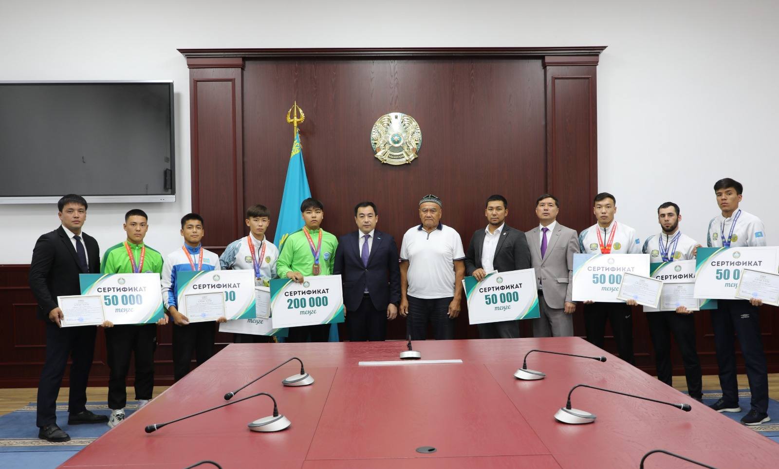 Салтанатты қабылдауда аудан әкімі ел намысын қорғап, байрақты бәсекелерде жеңіс тұғырынан көрінген спортшыларды арнайы марапаттап, қаржылай сертификаттар табыстады.