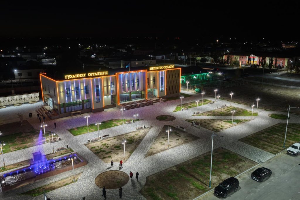 «Руханият орталығы» ауласына тамшылатып суару жүйесі орнатылып, газон төселді. Сонымен қатар, заманауи жарық шамдары, демалыс орындықтары мен субұрқақ кешені тұрғындардың серуендеп, тынығуына қолайлы жағдай қалыптастырған.