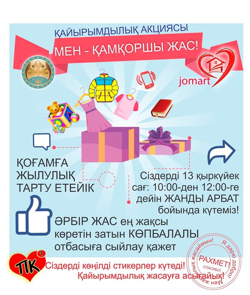 Әрбір жас өзінің ең жақсы ұнататын затын (мезгілдік киімдер, кітап, ұялы телефон, ойыншықтар және т.б.) сыйға тарту арқылы көпбалалы отбасыларға қуаныш сыйлауға мүмкіндігі бар. Осы бастама арқылы жылулық тарту етейік! Сіздерді жақсылық пен қамқорлық жасауға деген мүмкіндікті жіберіп алмай, белсенділік танытуға және қайырымды іске өз үлесіңізді қосуға шақырамыз!