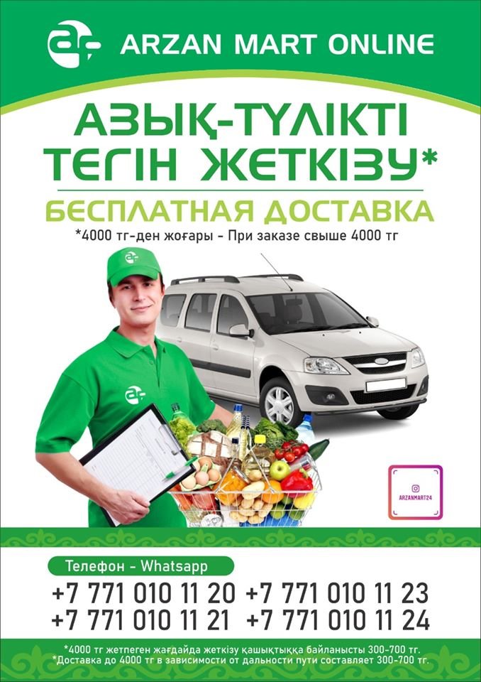 Елімізде төтенше жағдайдың енгізілуіне байланысты «ARZAN MART» ЖШС-гі (24 сағат қызмет көрсететін «Arzan market pharm» супермаркет желісі) үйінен онлайн түрде азық-түлік тауарларына жеткізіп беру қызметін ұсынады.