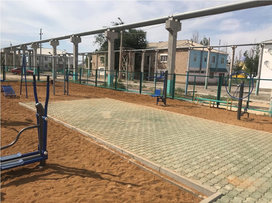 Шағын аумақтағы алаңда салауатты өмір салтын сақтап, бұқаралық спорт түрлерімен айналысатын 9 тренажерлық жаттығу құралы бар. Бұл жерде тұрғындар әр күн сайын таңертең және кешкілік уақыттарда өз беттерінше немесе спорт жаттықтырушыларының қадағалауымен түрлі жаттығу жұмыстарын жүргізе алады.