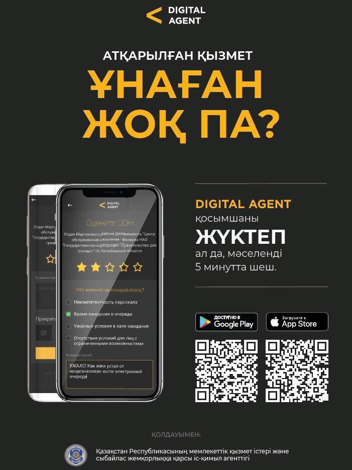 Қазақстан Республикасы Мемлекеттік қызмет істері және сыбайлас жемқорлыққа қарсы іс-қимыл агенттігінің бастамасымен «Цифрлы агент» (Digital agent) мобильді қосымшасы іске қосылды.Digital agent мобильдік қосымшасының артықшылығы – мемлекеттік көрсетілетін қызметті алушылардың шынайы уақытта қызмет көрсету сапасына қатысты өз шағымын және тиісті бағасын беру мүмкіндіктері бар.