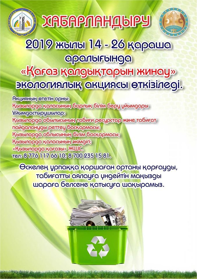 Қызылорда облысында «Қызылорда Қағазы» ЖШС қалдықтарды сұрыптау және өңдеумен айналысып, макулатура, қартон, қағаз, қалдықтарын сұрыптап, өңдеуді жүзеге асыруда. «Қызылорда Қағазы» ЖШС күнделікті тұрмысқа қажетті әжетхана қағаздарын шығаруда. Биыл 700 тонна қағаз қалдықтарын өңдеу жоспарлауда.