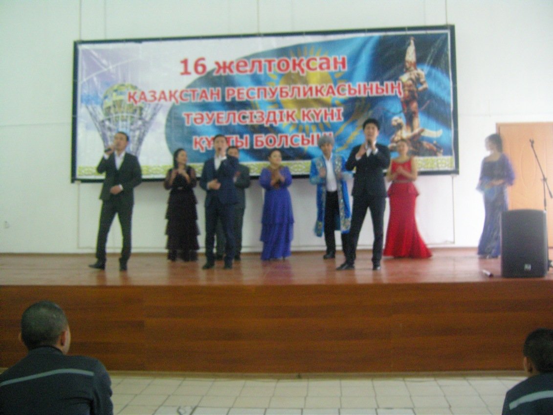 Мекеме жасақтарынан құралған 150-ге тарта жаза мерзімін азаматтаға арнайы ұйымдастырылған концерттік бағдарлама еліміздің Мемлекеттік Әнұранымен ашылып, мекеменің сотталғандар арасында әлеуметтік-психологиялық тәрбие жұмыстары бойынша бөлімінің бастығы әділет капитаны Д.Ералиевтің мерекелік құттықтау сөзі тыңдалды. Сондай-ақ өнерпаз әншілердің мерекелік және патриоттық тақырыптағы (Атамекен, Қазақ елі, Туған жер, Беу айдай, Нақыл, Менің қазағым, Бүлдірген) әндері жаза мерзімін өтеуші азаматтардың патриоттық сезімдерін оятып, көтеріңкі көңіл күй сыйлады. Жазасын өтеуші азаматтармен атқарылып жатқан осындай игі шаралар өте маңызды және тәрбиелеу шарасындағы ықпалдың бірден-бір айқын тұсы деп есептейміз.
