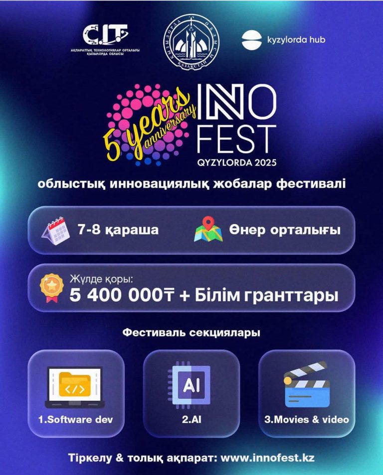 Қызылордада 2025 жылдың 7-8 қараша күндері облыс әкімінің қолдауымен мерейлі 5 жылдық «Inno.Fest» Qyzylorda 2025 инновациялық жобалар фестивалі өтеді.