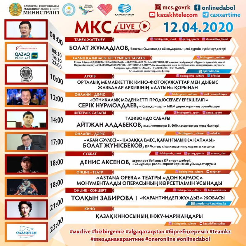 Сонымен қатар сағат 14:00-де Айтжан Алдабеков таэквондадан шеберлік сабағын өткізсе, 18:00-де автоспорт бойынша ҚР спорт шебері Денис Аксенов сұхбат береді. Онлайн театр жобасы аясында «Астана Опера» театры «Дон Карлос» монументалды операсының көрсетілімін ұсынады.
