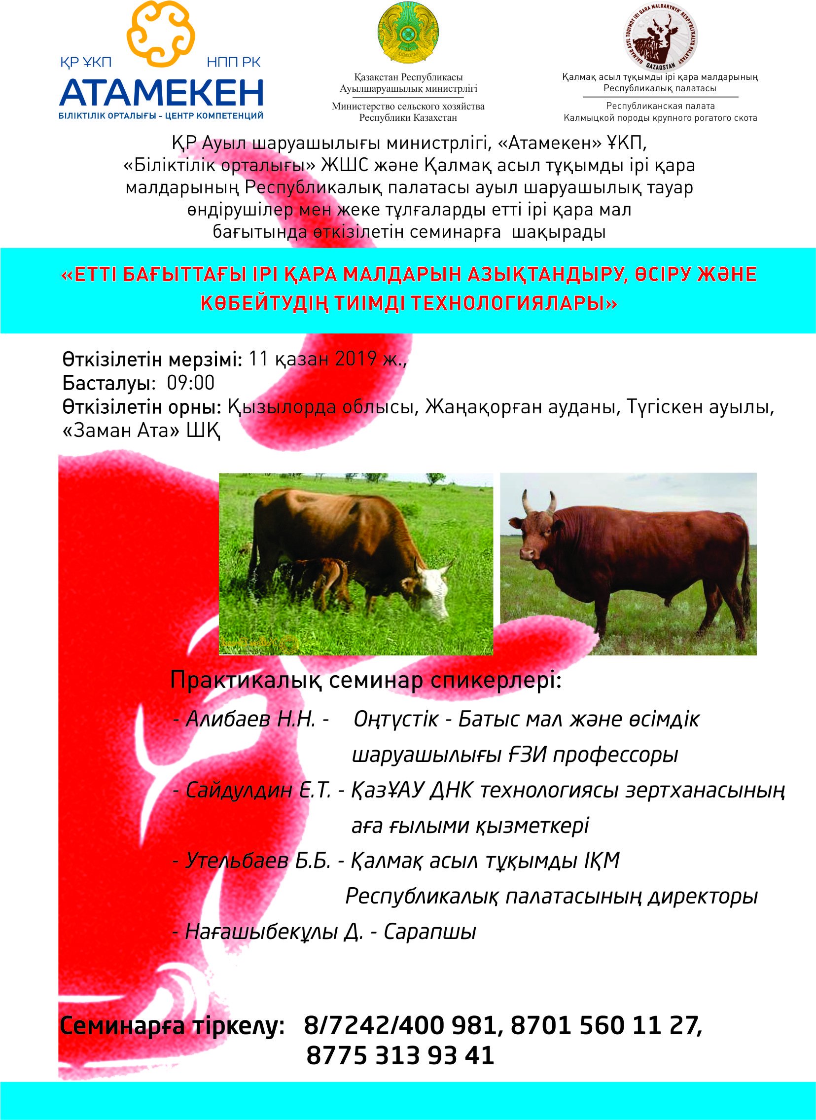 Қызылордада «Атамекен» ҰКП, «Біліктілік орталығы» ЖШС және Қалмақ асыл тұқымды ірі қара малдарының Республикалық палатасы ауыл шаруашылық тауар өндірушілер мен жеке тұлғаларға арнап етті ірі қара мал бағытында семинар өткізуді жоспарлап отыр.