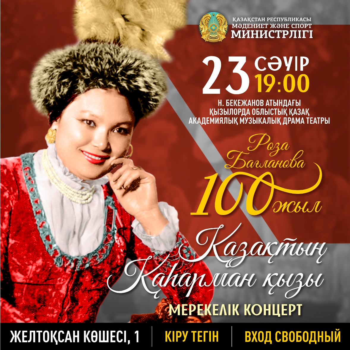 23 сәуірде сағат 19.00-де Қызылорда қаласында Нартай Бекежанов атындағы Қызылорда облыстық қазақ академиялық музыкалық драма театрында Қазақстанның Халық әртісі, Халық қаһарманы Роза Бағланованың 100 жылдық мерейтойына арналған «ҚАЗАҚТЫҢ ҚАҺАРМАН ҚЫЗЫ» атты мерекелік концерт өтеді.
