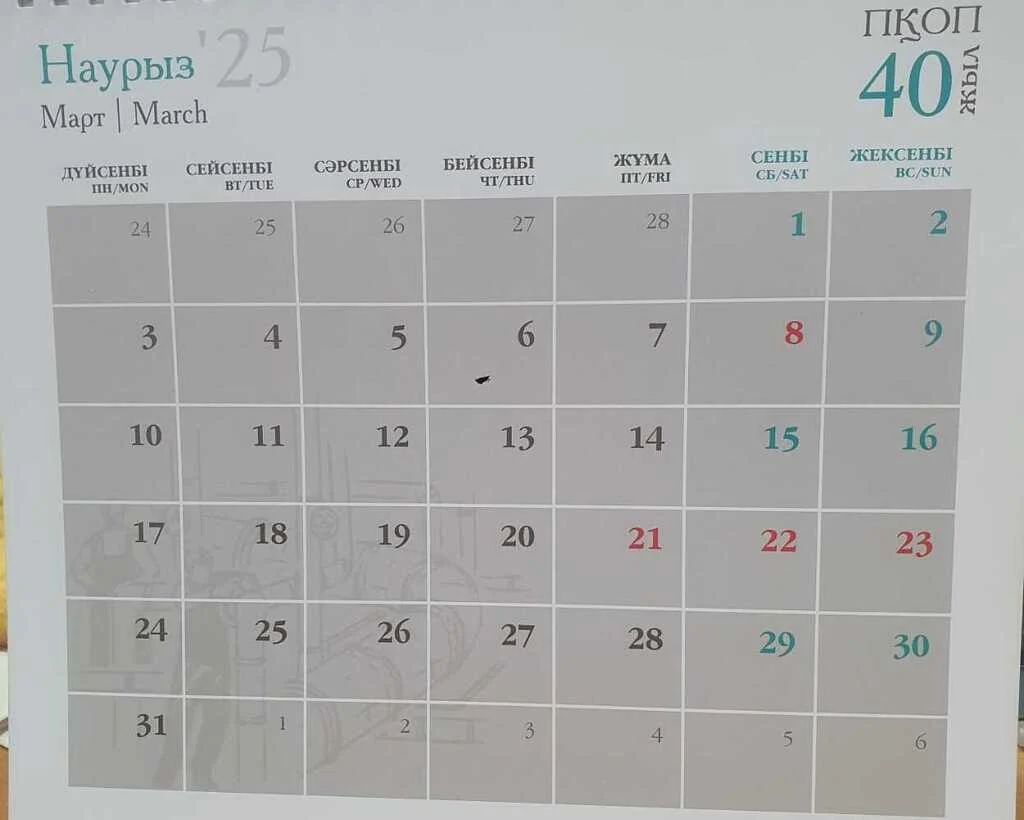 - алты күндік жұмыс аптасы үшін демалыс күндері 21, 22, 23 және 24 наурыз болады, ал сейсенбі, 25 наурызда жұмысқа шығады.