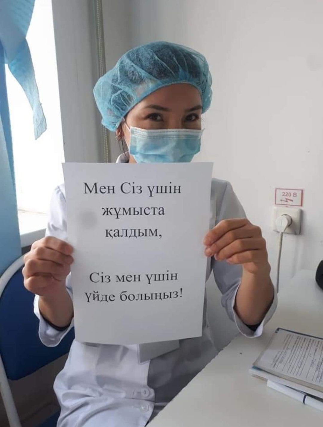 Суретте дәрігерлер «Мен Сіз үшін жұмыста қалдым, Сіз мен үшін үйде болыңыз» деген жазуы бар парақ ұстап тұр.