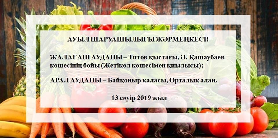 Ағымдағы жылдың 13 сәуір күні Қызылорда қаласында Жалағаш ауданының және Байқоңыр қаласында Арал ауданының ауыл шаруашылығы жәрмеңкелері өткізіледі.