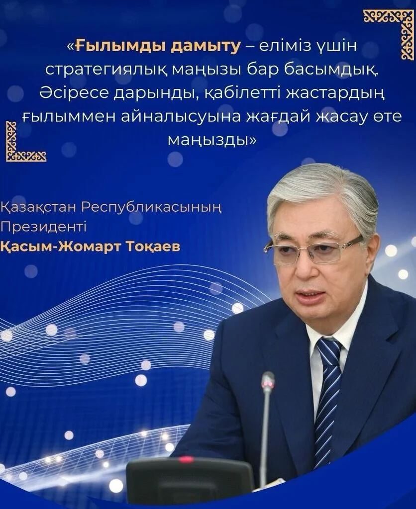 «Ғылымды дамыту – еліміз үшін стратегиялық маңызы бар басымдық. Әсіресе дарынды, қабілетті жастардың ғылыммен айналысуына жағдай жасау өте маңызды», – деп атап өтті Мемлекет басшысы Ғылым және технологиялар жөніндегі ұлттық кеңесте.